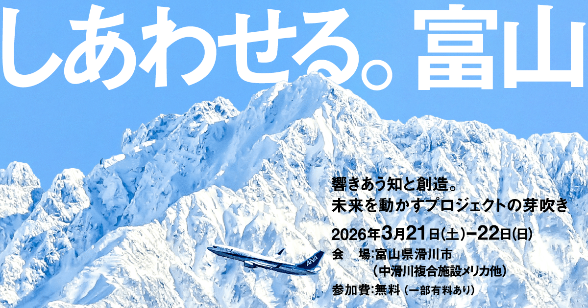 富山県のビジョン「幸せ人口1000万~ウェルビーイング先進地域、富山~」の実現に向けて、県内外の方が集い、熱く議論することで、未来につながる新しい動きを創ることを目的に、「しあわせる。富山」を開催します。